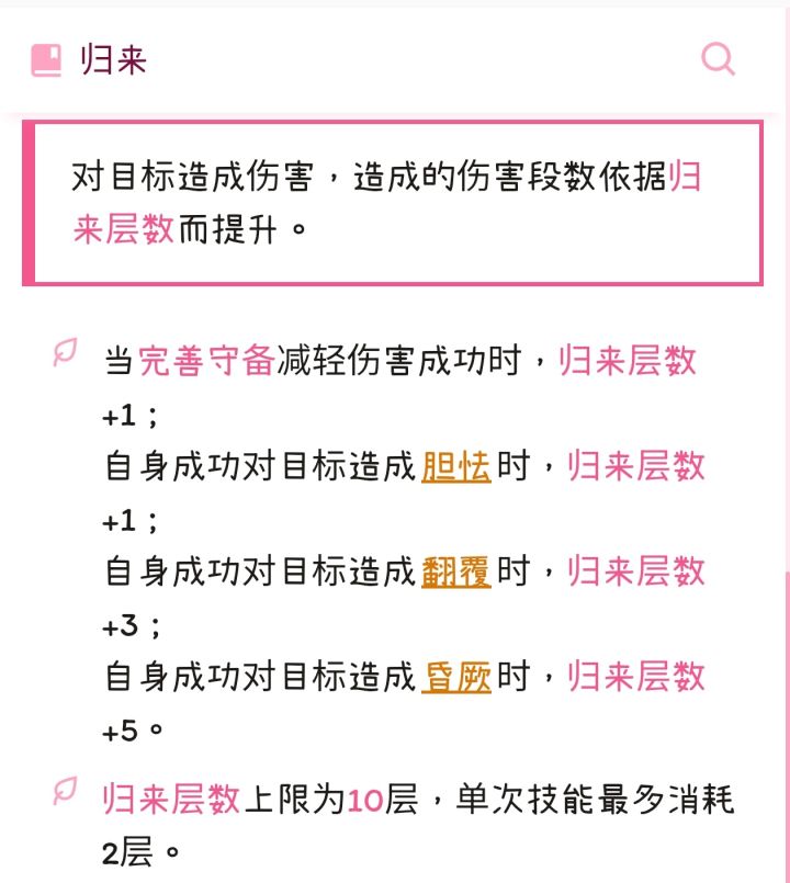 作为剑盾的主要输出技能,拥有基础灵巧提供的倍率加成和消耗层数来提供额外伤害段数的机制,满足各类条件(如图)即可获得归来层数加成。