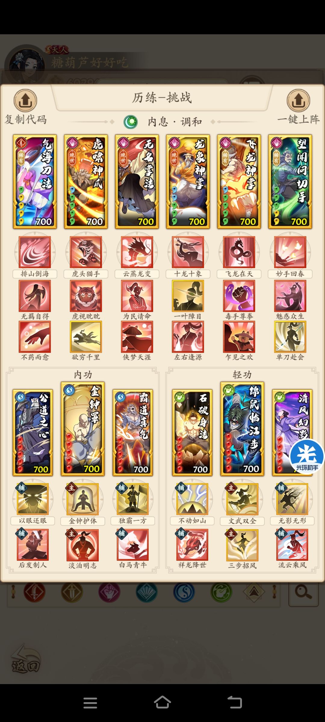 当然调和拳的内功轻功选择很多除了金钟霸道不动,别的普通可以换邪魔金顶或者为家等稀有,下面是内功轻功搭配,新招式主辅都一样,只是解破绽位置不同