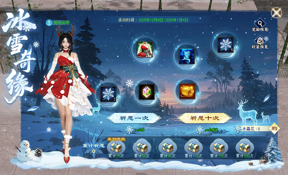 手握冰晶花,不妨来试试手气吧! 消耗活动代币冰晶花进行抽奖,即有机会获得限定时装:圣诞派对(永久),穿上新衣美美跨年!