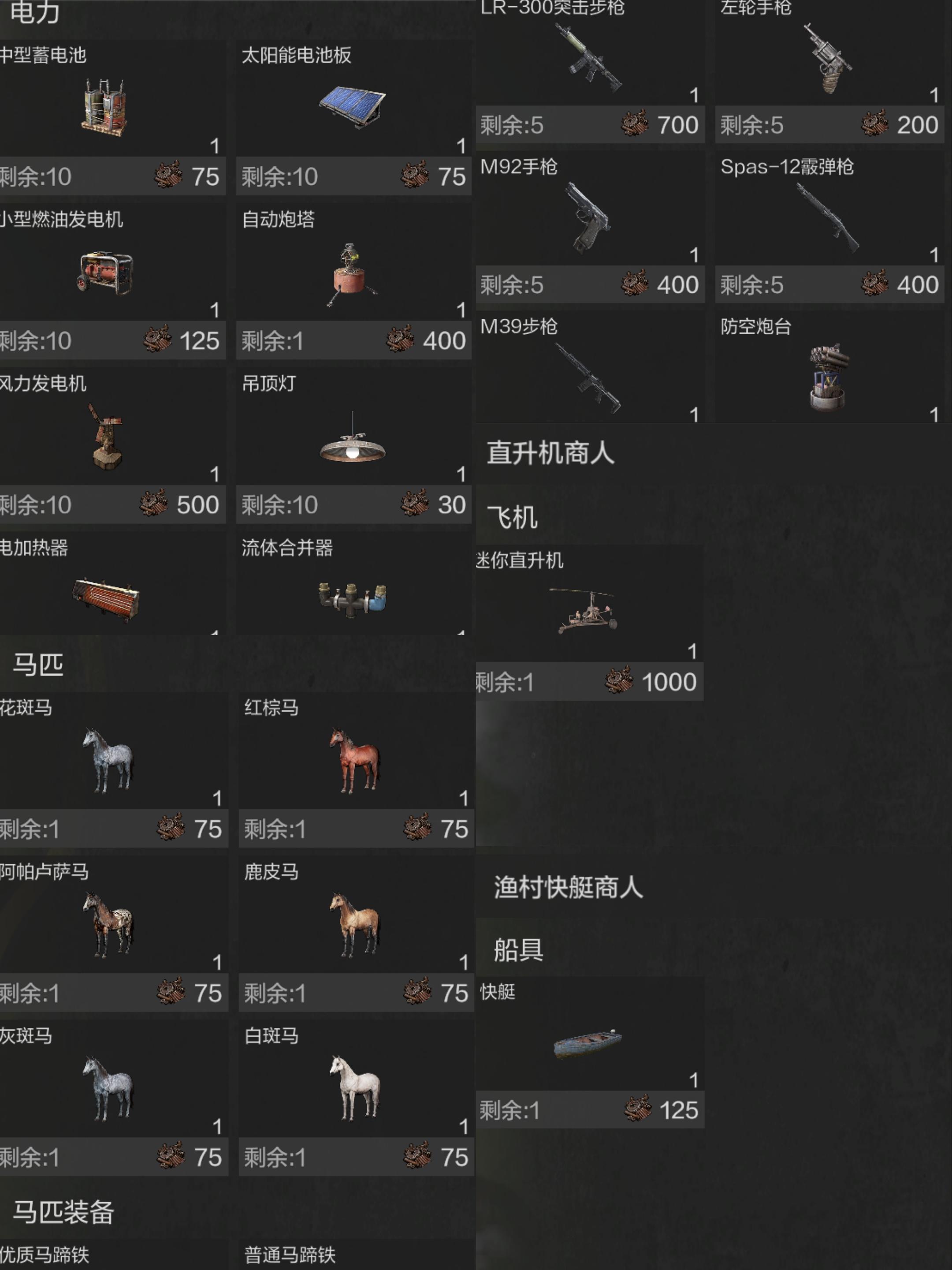 最后也是非常重要的一个资源点,那就是分布在地图各个安全区中的售卖机。我们可以在售货机中买到马匹,电力设备,工具,枪械甚至是飞机。他可以在我们前期开荒时提供助力,也能够在后期提供巨大收益。前期我们可以在售卖机购买一些工具以及低阶枪械,能够大大加快开荒进度;而后期我们也能在售卖机购买飞机和高级电力工具,能够为出行提供便利,也能守护我们的家园。
