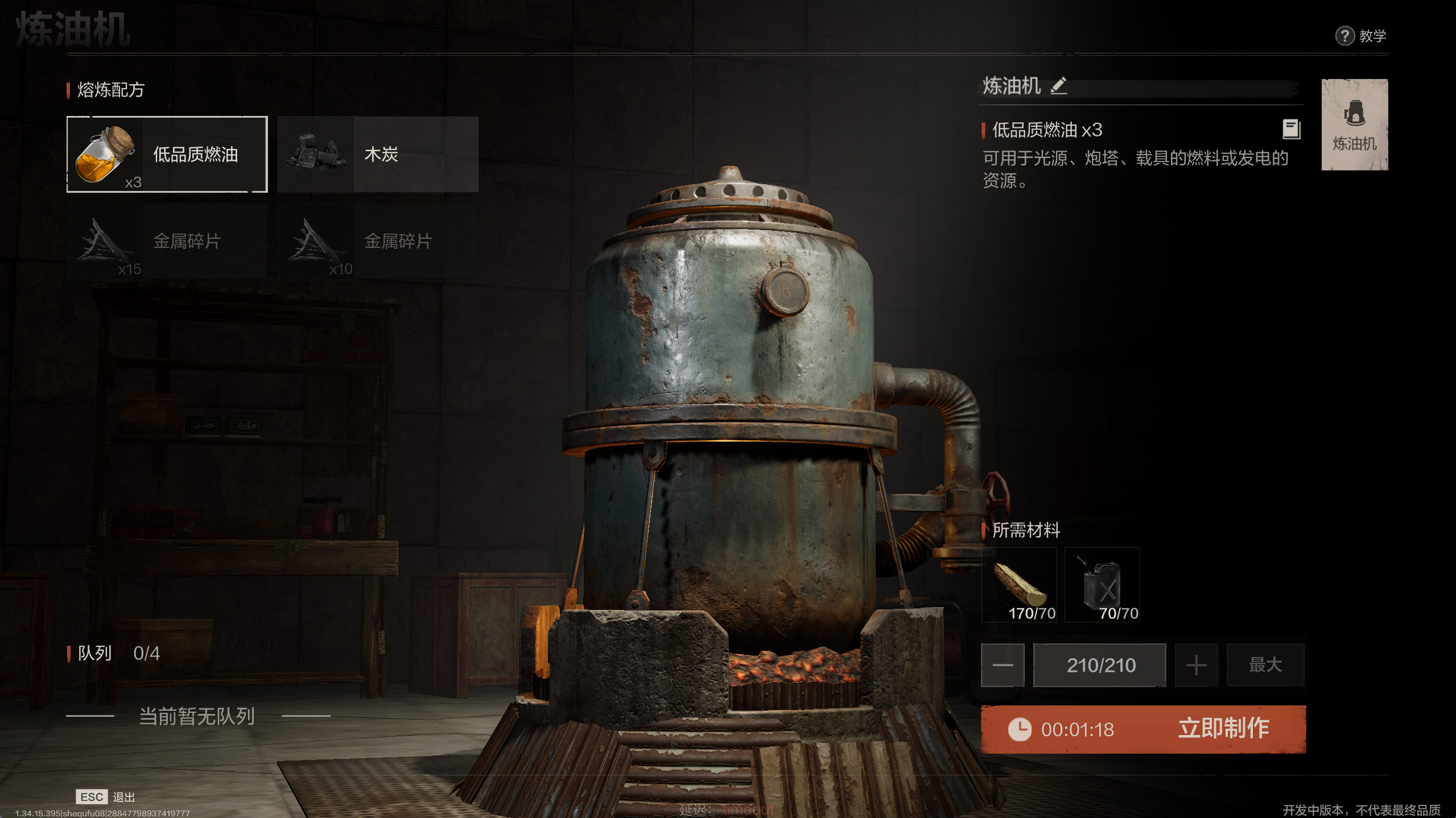 在点开炼油机的界面我们就可以看到炼制燃油所需的原油,木头以及所需时间。同时我们也可以烧制木炭,唯一和分解机不同的是,炼油机可以在中高级资源箱中获取并且可以学习制作,故而据点中的炼油机更适用于前期开荒燃油需求时使用。