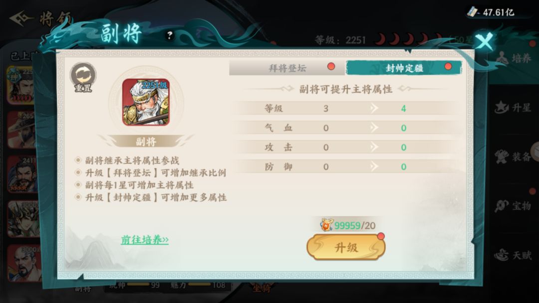 2、副将每1星可增加主将属性,可使用封帅令、将军印升级【封帅定疆】可增加更多属性。