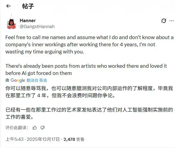 曾在拉瑞安任职、网名为Hanner的前员工就表示:她此前在质量测试和制作岗位工作,管理层在开发者并不情愿的情况下强行推行生成式AI