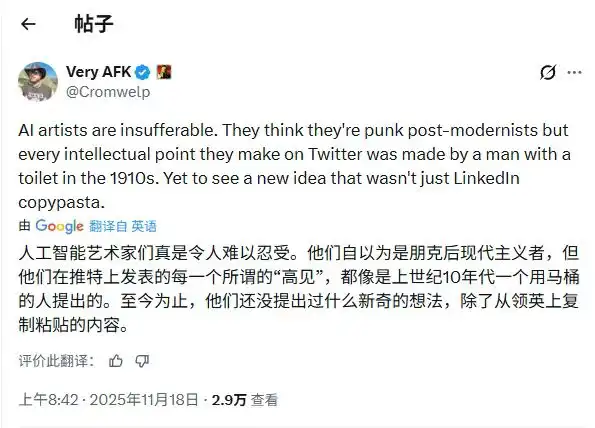 拉瑞安的发行总监迈克尔·道斯也曾多次以相当激烈的措辞批评AI创作,称其为“没有灵魂、毫无意义的噪音”,甚至是“对人类的拙劣讽刺”。
