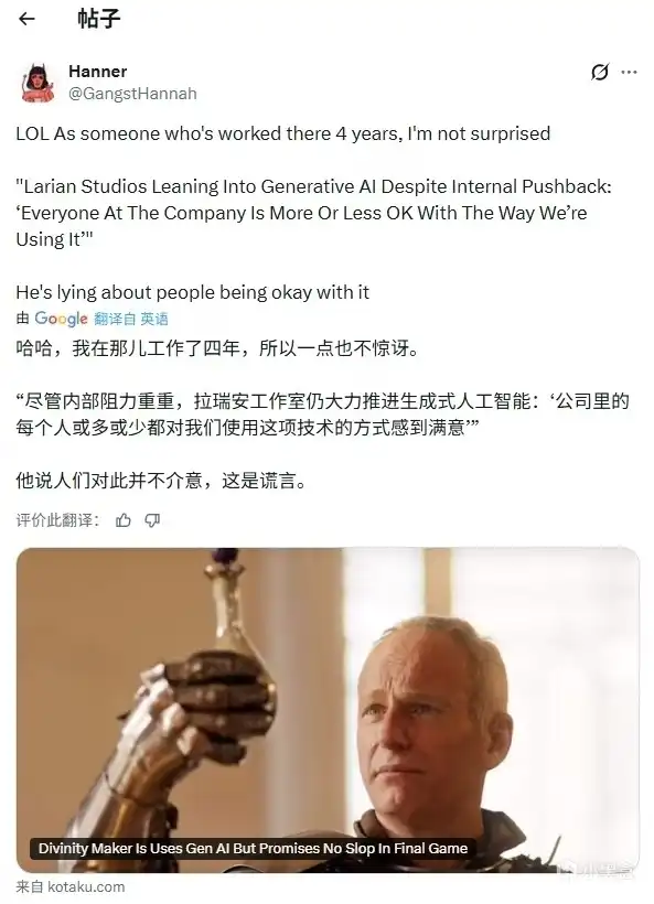 事态发酵!前员工指责拉瑞安CEO就《神界》AI使用情况撒谎!