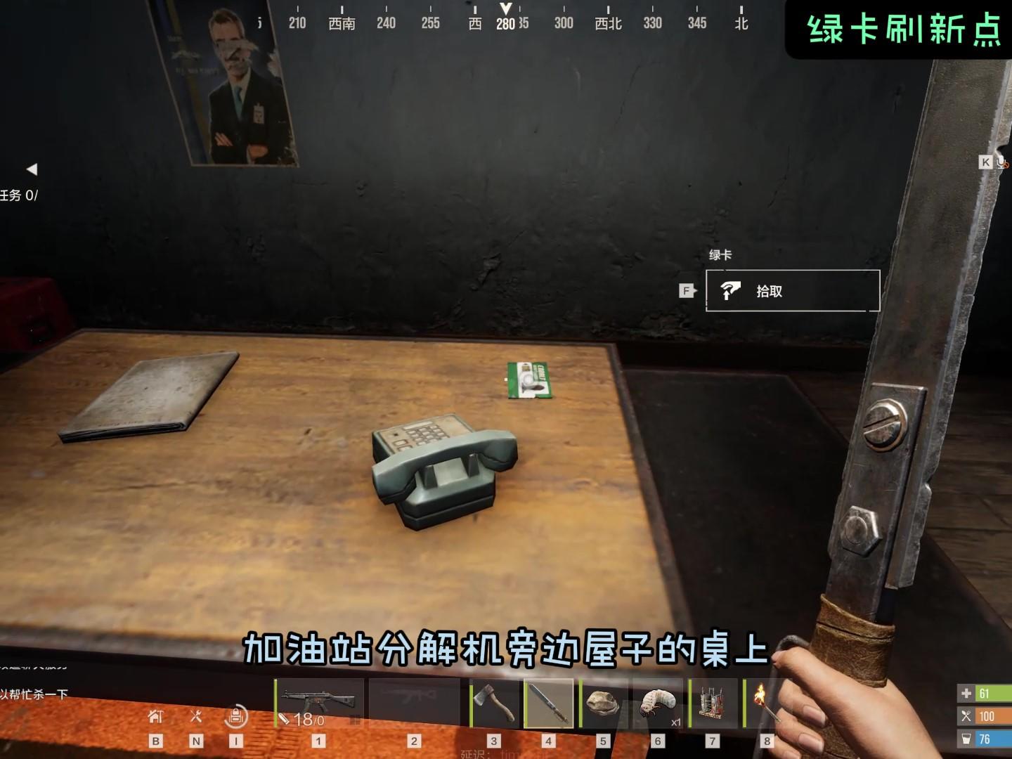 1、 绿卡刷新点:加油站分解机旁边屋子桌子上