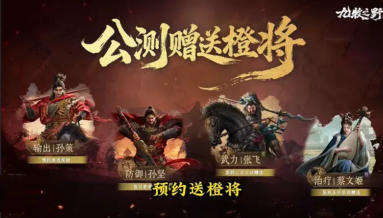 登录与签到福利:直接赠送橙将,预约送输出英雄孙策;首日登录送防御橙将孙坚;第二日签到活动赠送张飞;签到五日活动赠送蔡文姬。