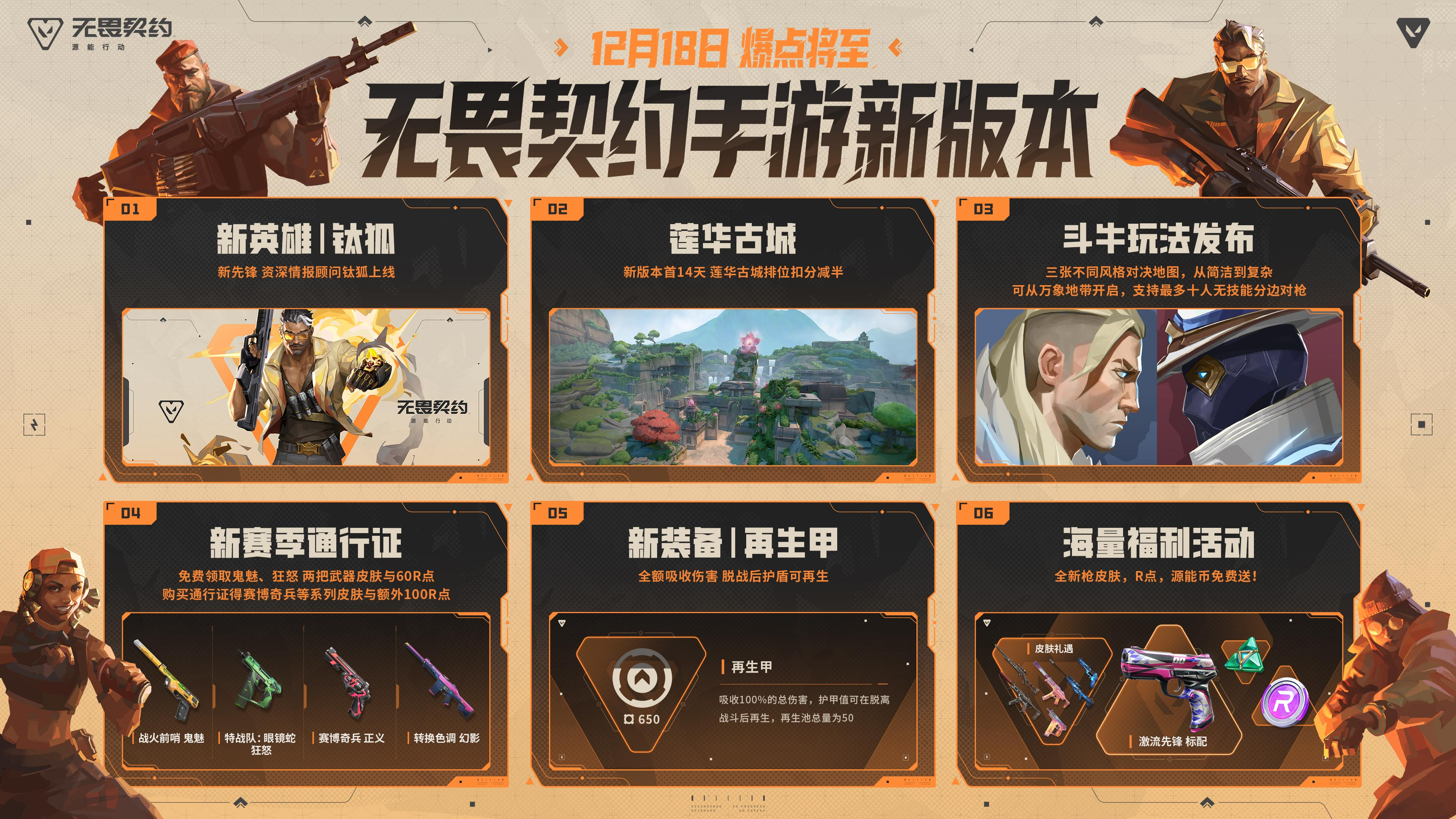 新英雄「钛狐」悄然加入战局,莲花古城排位助力同步开启!更有快节奏「斗牛」玩法、可自动恢复的「再生甲」强势登场。全新通行证与海量福利活动也已全面上线,免费皮肤、R点、源能币等你来赢,新赛季一起引爆全场!