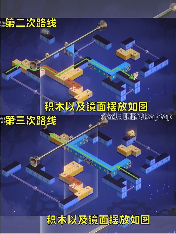 🕖帮派迷钟总共需要走三次,积木迷钟总共需要走四次,未来迷钟总共需要走两次,具体路线自己如何摆放积木镜面查看图片即可