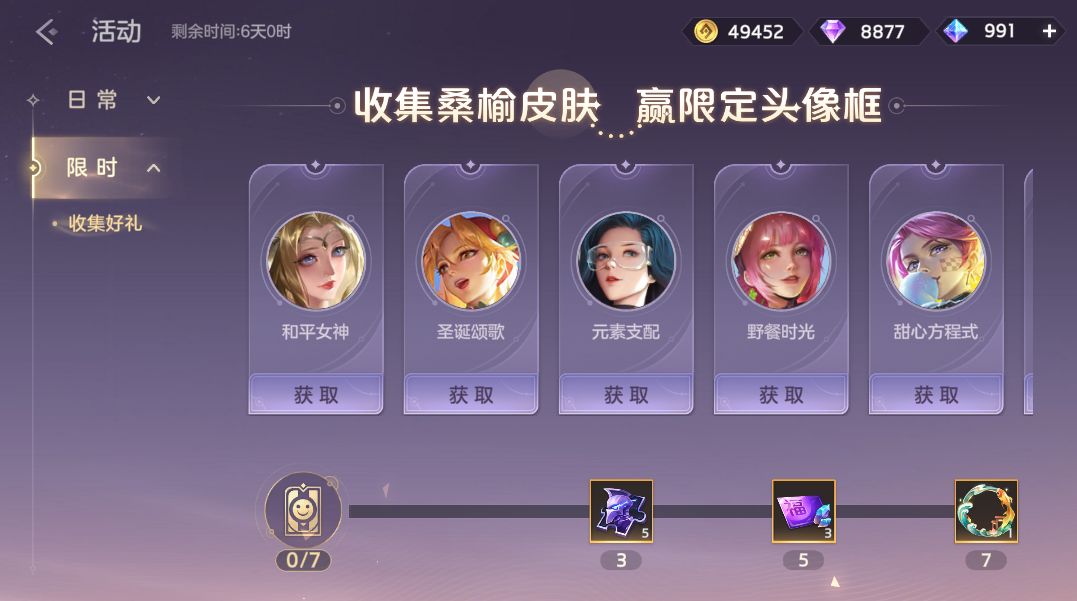 收集桑榆系列皮肤,根据收集进度可获得限定头像框锦鲤福源、龙魂祈福卡、皮肤碎片。