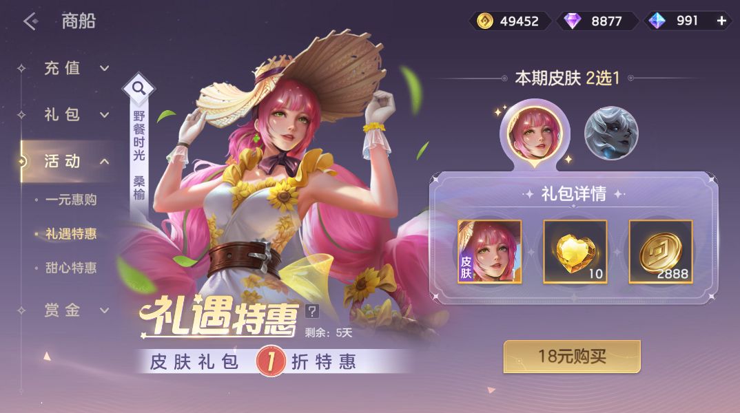 礼遇皮肤礼包限时1折!桑榆·野餐时光、阿尔忒弥斯·恐惧之契超值2选1获得。