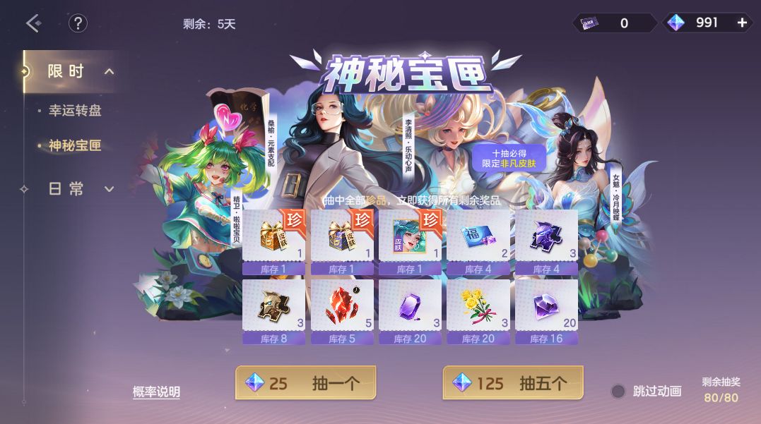 使用宝匣探秘券/龙晶进行抽奖,珍品奖励包含传说皮肤自选箱、史诗皮肤自选箱、露西亚·热浪之夏;高级奖励包含赤焰灵玉、皮肤碎片、英雄碎片、钻石祈福卡等。最多10抽必得露西亚·热浪之夏,抽完所有珍品奖励可获取剩余所有奖励。