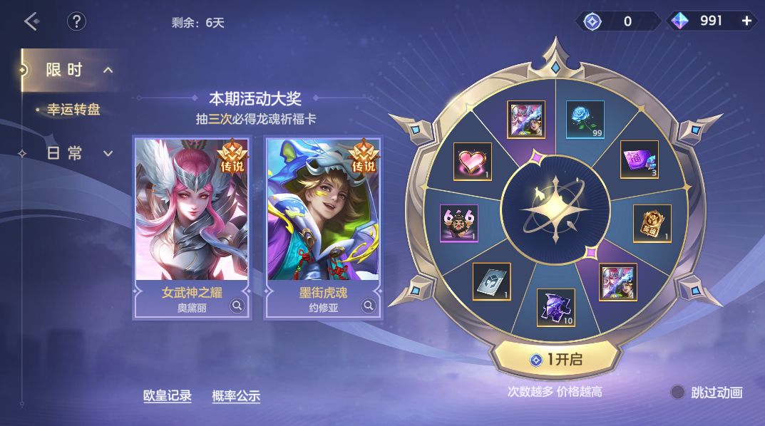 使用龙晶购买幸运币,进行抽奖。奥黛丽·女武神之耀、约修亚·墨街虎魂、英雄自选箱、666表情、龙魂祈福卡、皮肤碎片、好感度礼包、改名卡等奖励等你来抽!最多3抽获得龙魂祈福卡,最多6抽获得1款皮肤,最多9抽可获得全部奖励,前2抽抽到皮肤的守护者会获得欧皇称。.