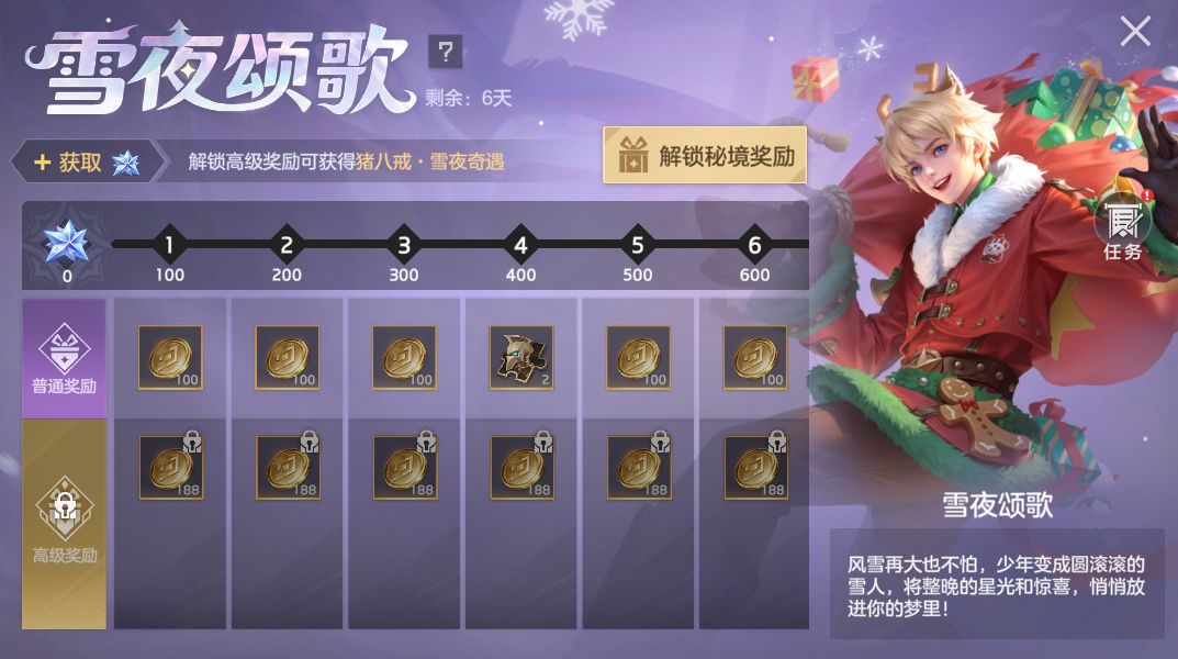 完成任务提升等级免费获取钻石祈福卡、英雄碎片等奖励,付费30元获得新款圣诞皮肤猪八戒·雪夜奇遇、新款聊天框圣诞夜话;付费128元额外获得传说限定皮肤自选箱(含西施·终极阻断、伏羲·光影圣灵)、橙心钻等奖励。