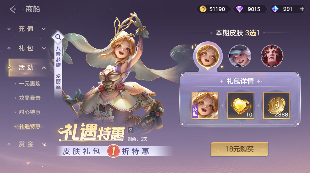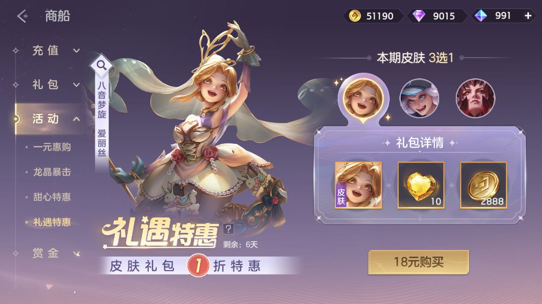 礼遇皮肤礼包限时1折!爱丽丝·八音梦旋、白浩·潮玩神龙、妇好·灭世之威超值3选1。