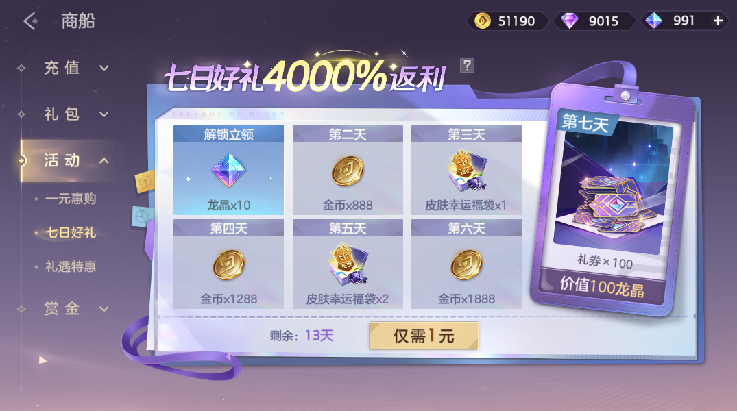付费1元解锁登录活动,登录即可获得龙晶*10、皮肤幸运福袋(必得皮肤碎片*2、概率额外获得传说皮肤自选箱)、金币奖励,累计登录7天可得100礼券。