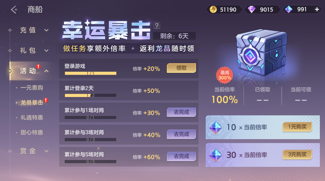 付费1元/3元解锁龙晶暴击,完成任务最高可获得30/90龙晶奖励。两个档位可同时充值,奖励数量叠加,最高可领取120龙晶。