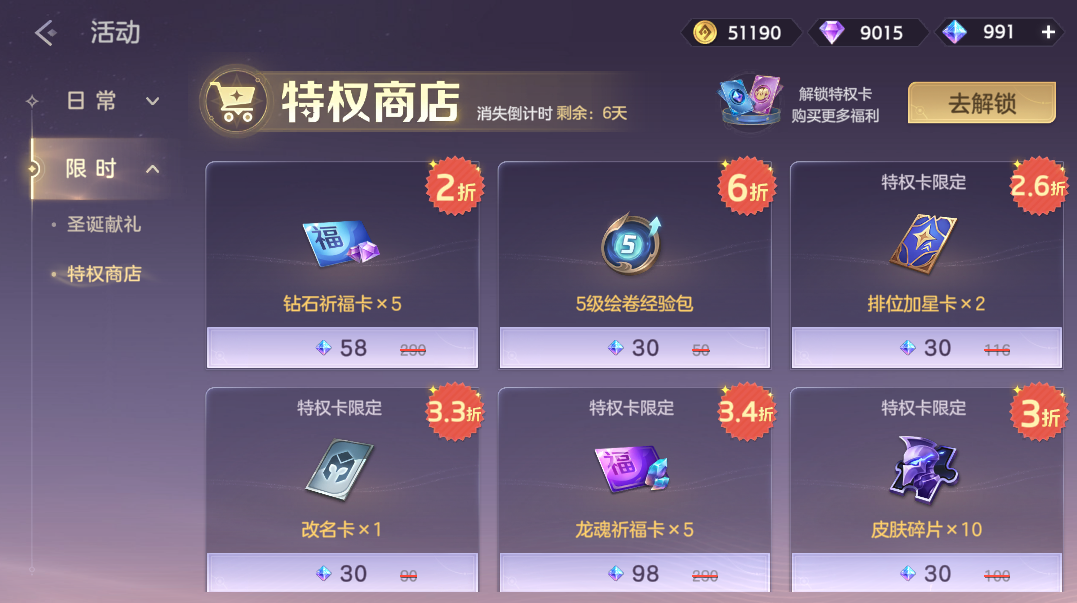 解锁特权卡,享超值折扣,使用龙晶购买龙魂祈福卡、排位加星卡、皮肤碎片、改名卡等多种福利。