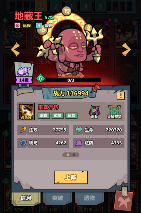 地藏王:具有麻痹作用的远程法术型神将,必杀技雷莲万钩可以对最近敌人造成50%攻击力伤害,并生成环状电弧对其附近敌人造成50%攻击力范围伤害,造成5秒麻痹,每秒造成50%攻击力麻痹伤害,大其运营效果增加对局内经济情况。