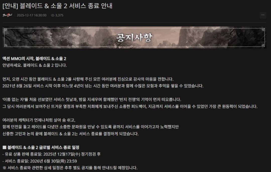 游戏厂商NCSoft日正式发布公告,宣布《剑灵2》韩服将于2026年6月30日23点59分停止服务,为四年多的运营历程画上句点。