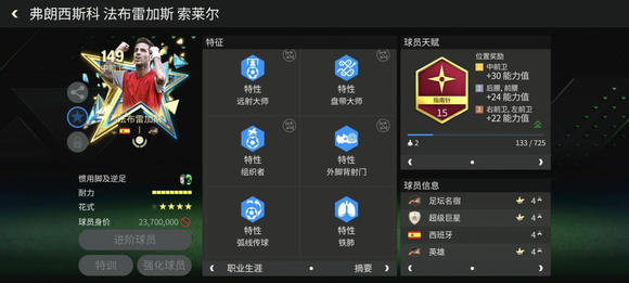 特性方面,长传大师、组织者、弧线传球三项特性让小法拥有极强的传球视野、长传精准度和进攻策动能力;远射大师、盘带大师、外脚背射门三项特性则让小法持球摆脱防守后,在对方前场任意威胁区域轻松得分;除此之外,小法还配备了铁人、铁肺两项特性,加强了身体对抗和比赛75分钟落后时的体力恢复。#fc足球世界