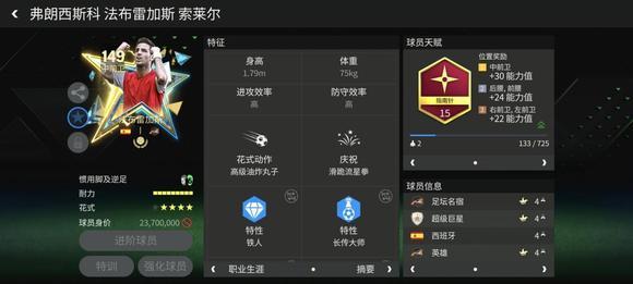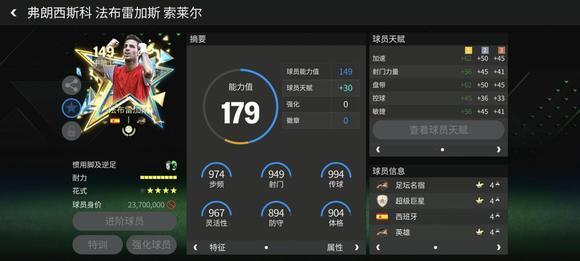 天赋方面,法布雷加斯配备的是游戏中前卫球员热门天赋指南针,增强了小法的加速、射门力量、盘带、控球和敏捷五项数据,这让小法在实战中的远射和持球推进能力都有很大提升。小法作为FC足球世界游戏中第一个149中前卫球员,各项数据均是游戏顶尖水平,是游戏中的六边形战士。
