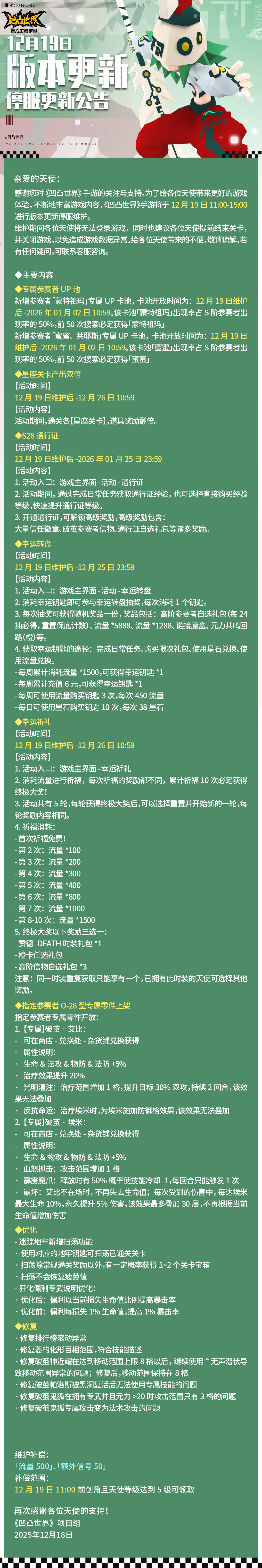 维护期间各位天使将无法登录游戏,同时也建议各位天使提前结束关卡,并关闭游戏,以免造成游戏数据异常。给各位天使带来的的不便,敬请谅解。