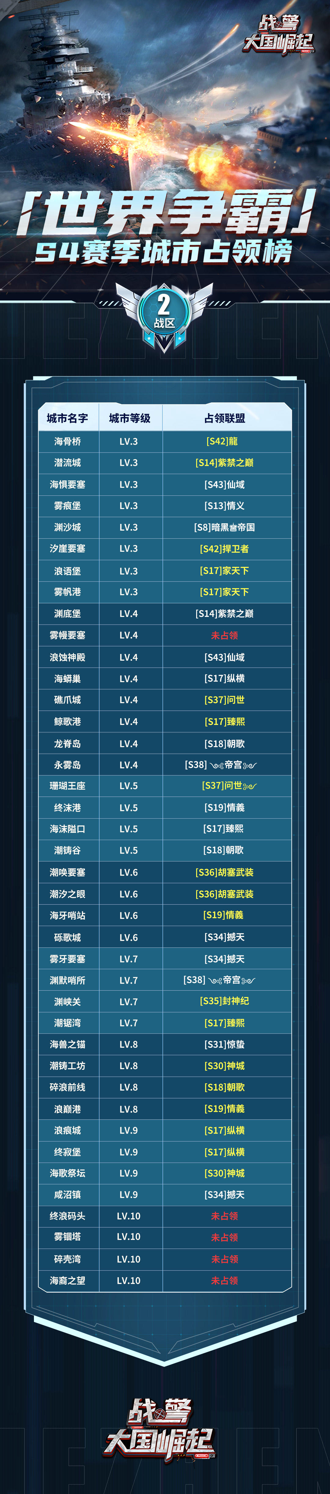 【海上速报】S4 赛季第四周世界争霸城市占领榜