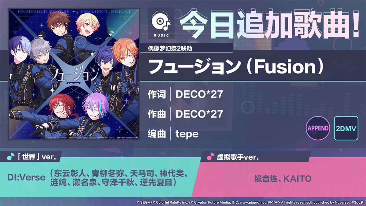 12/19 15:00起,追加[初音未来:缤纷舞台×偶像梦幻祭2]的联动歌曲《フュージョン(Fusion)》!