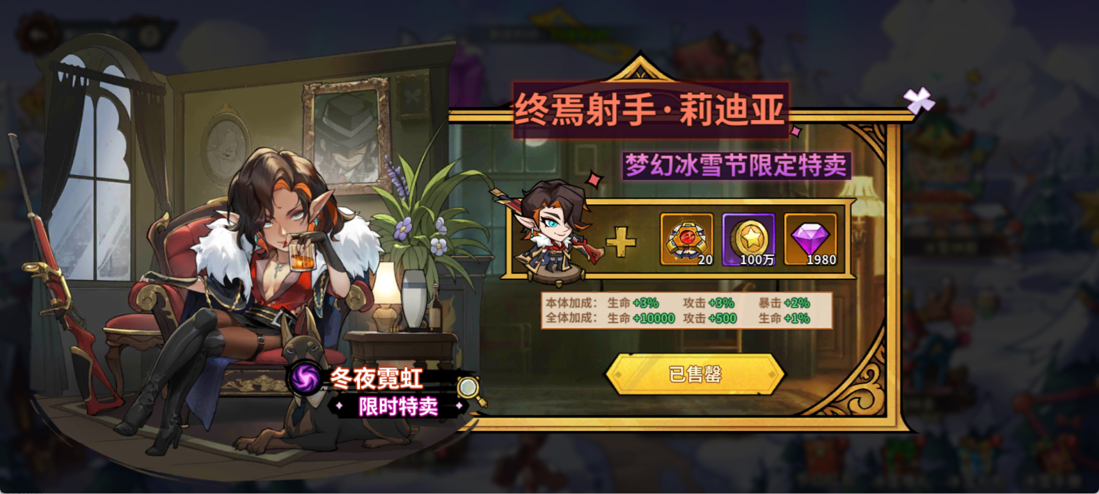 活动期间限时出售「终焉射手・莉迪亚」限定皮肤「冬夜霓虹」,自带本体 + 全体属性加成,喜欢的指挥官千万别错过。