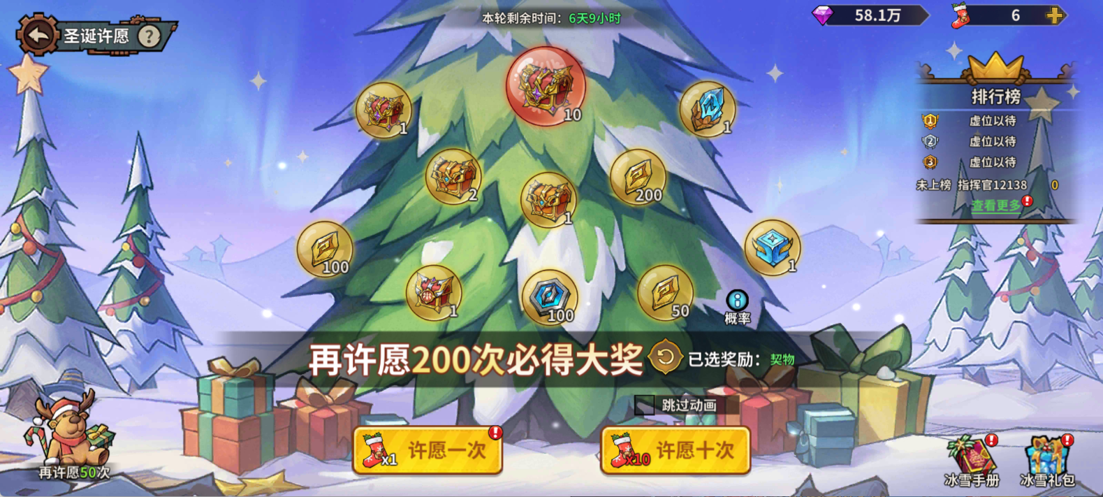 挑选心仪奖池,消耗「圣诞许愿袜」抽取奖励,许愿次数达到保底次数必定解锁大奖,每 7 天为 1 轮跨服排名(按许愿次数统计),轮末会发放丰厚的排行奖励。