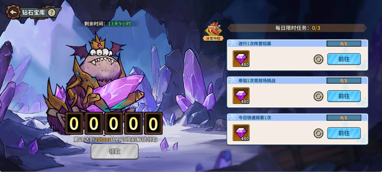 每日完成 3 个指定任务积累钻石,累计满 20000 即可提取;激活「冰雪特权」奖励额外 + 20%,活动结束未领钻石将随圣诞祝福邮件发放。