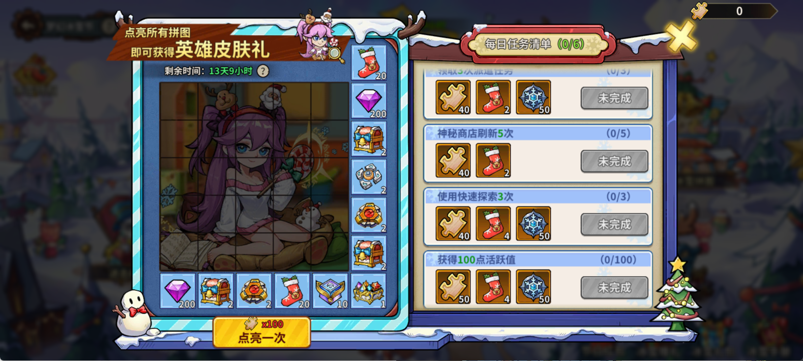 完成日常任务解锁拼图碎片,每格点亮均有奖励,全图点亮免费领取英雄皮肤🌟。