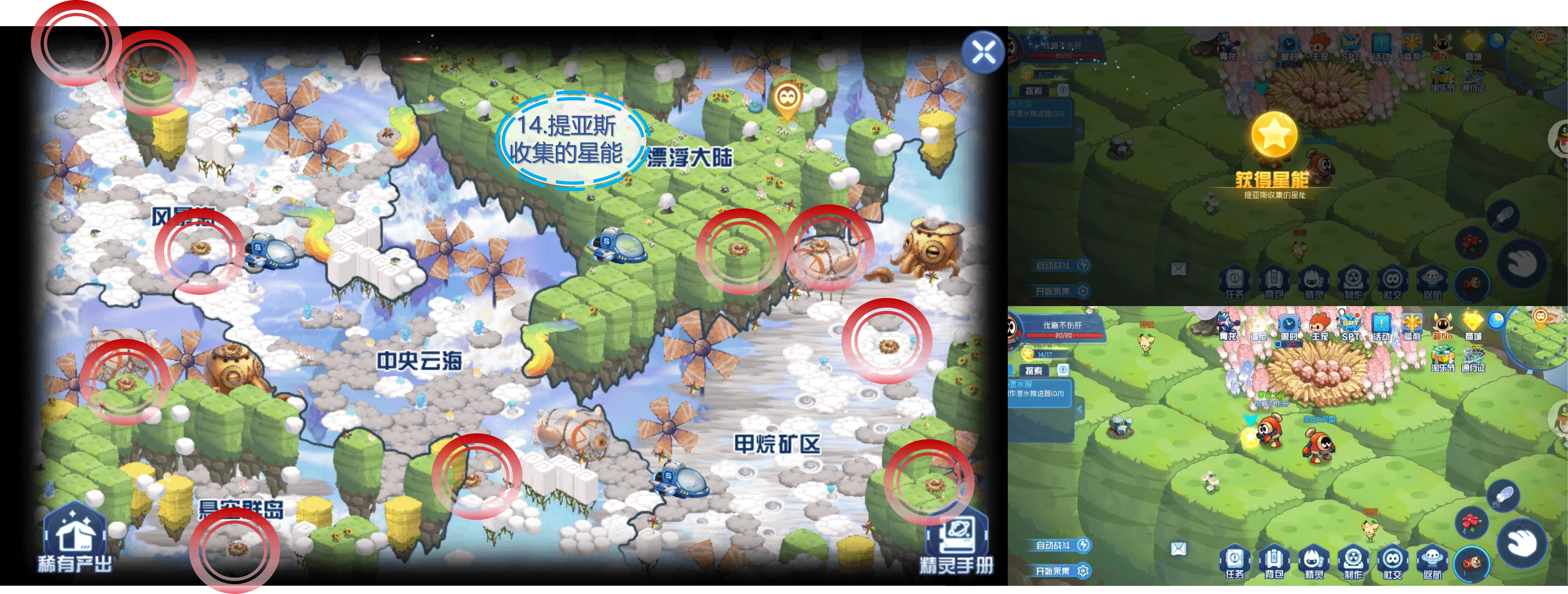 红色圈为普通星能(击败或者捕捉精灵、采集资源或者直接收集)