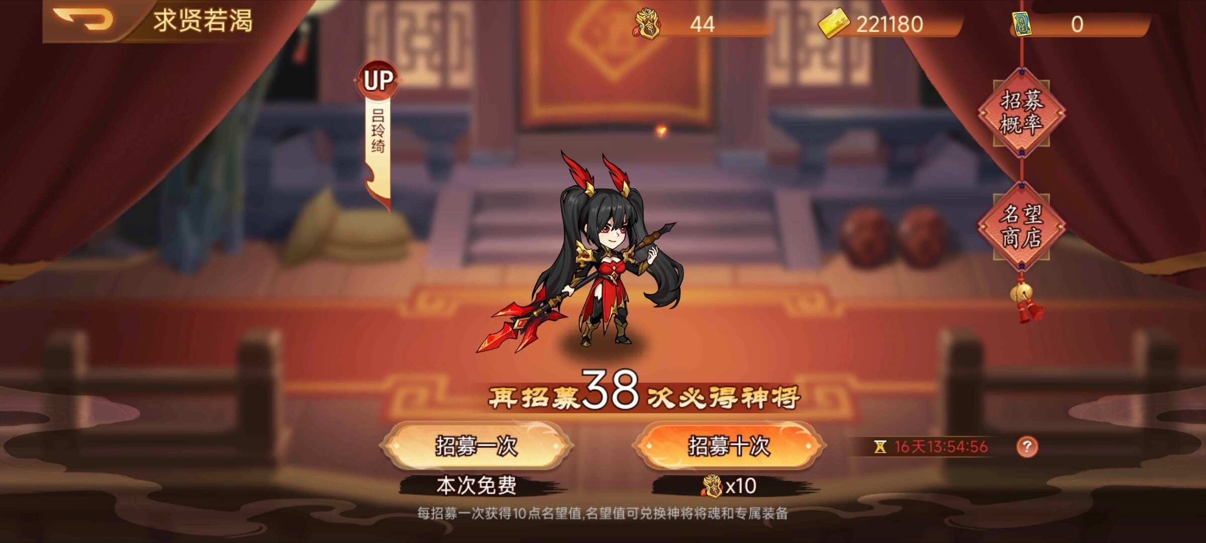活动内容:活动期间,可通过消耗招募令进行招募武将,up武将的概率会高于其他同档位武将(每期活动会更换up武将),每次招募可获得10名望,名望可在名望商店兑换道具。