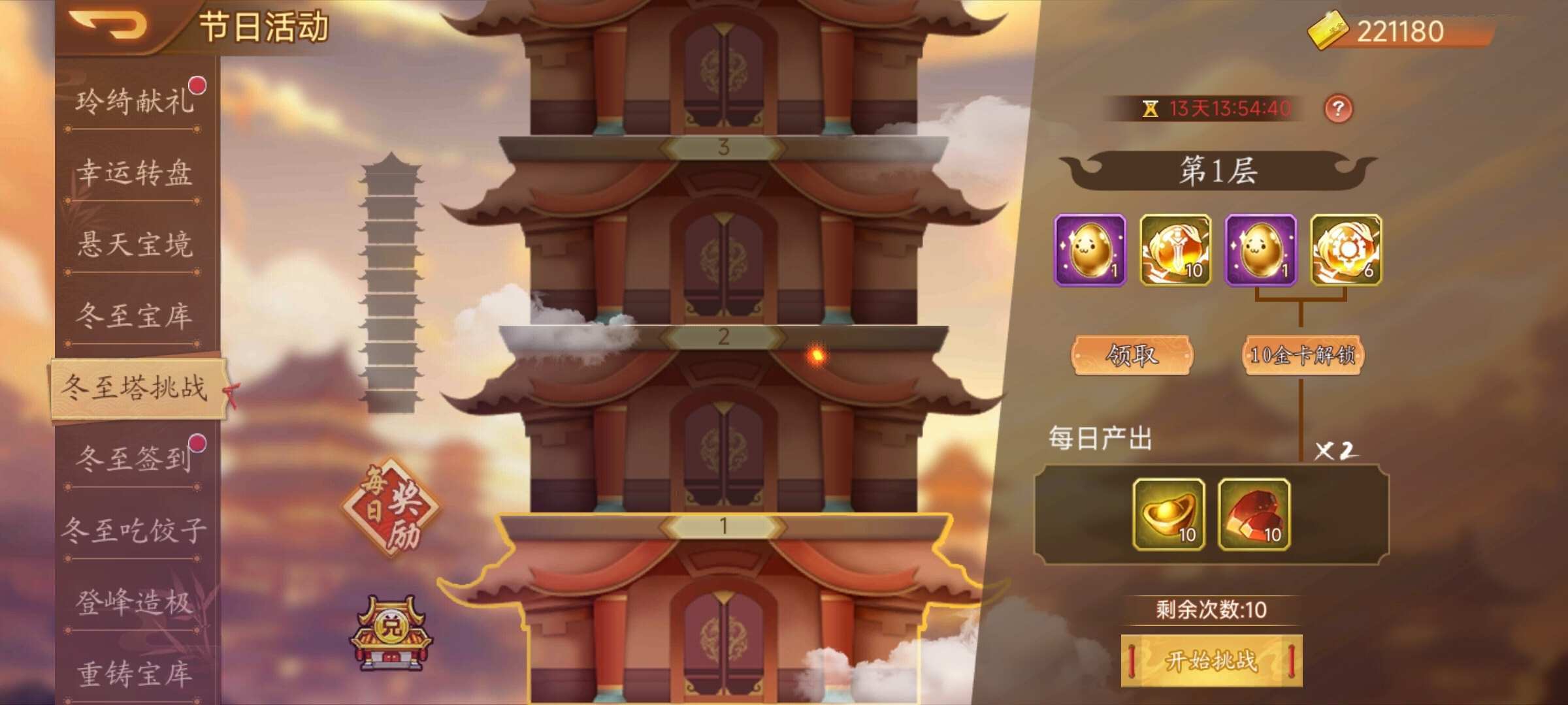 活动内容:活动期间,每天可挑战10次冬至塔(挑战失败不扣除次数),挑战成功即可解锁首通奖励,同时解锁该塔层的每日奖励(通关后次日开始领取),可消耗金卡解锁额外的首通奖励和双倍的每日产出,活动道具【金蛋】可在兑换商店兑换心仪道具。