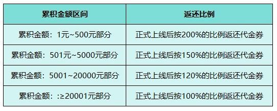 为回馈测试期间的支持,所有充值将按阶梯比例在公测时返还,具体规则如下: