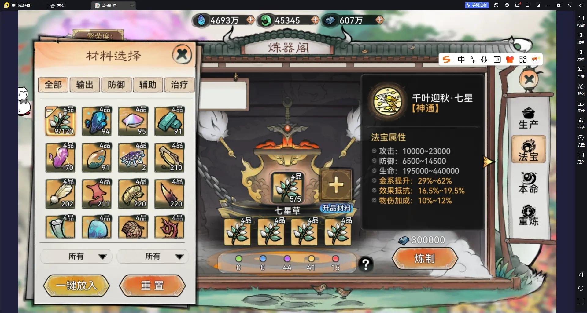 - 炼制方案:5个四阶材料 + 4个三阶材料;