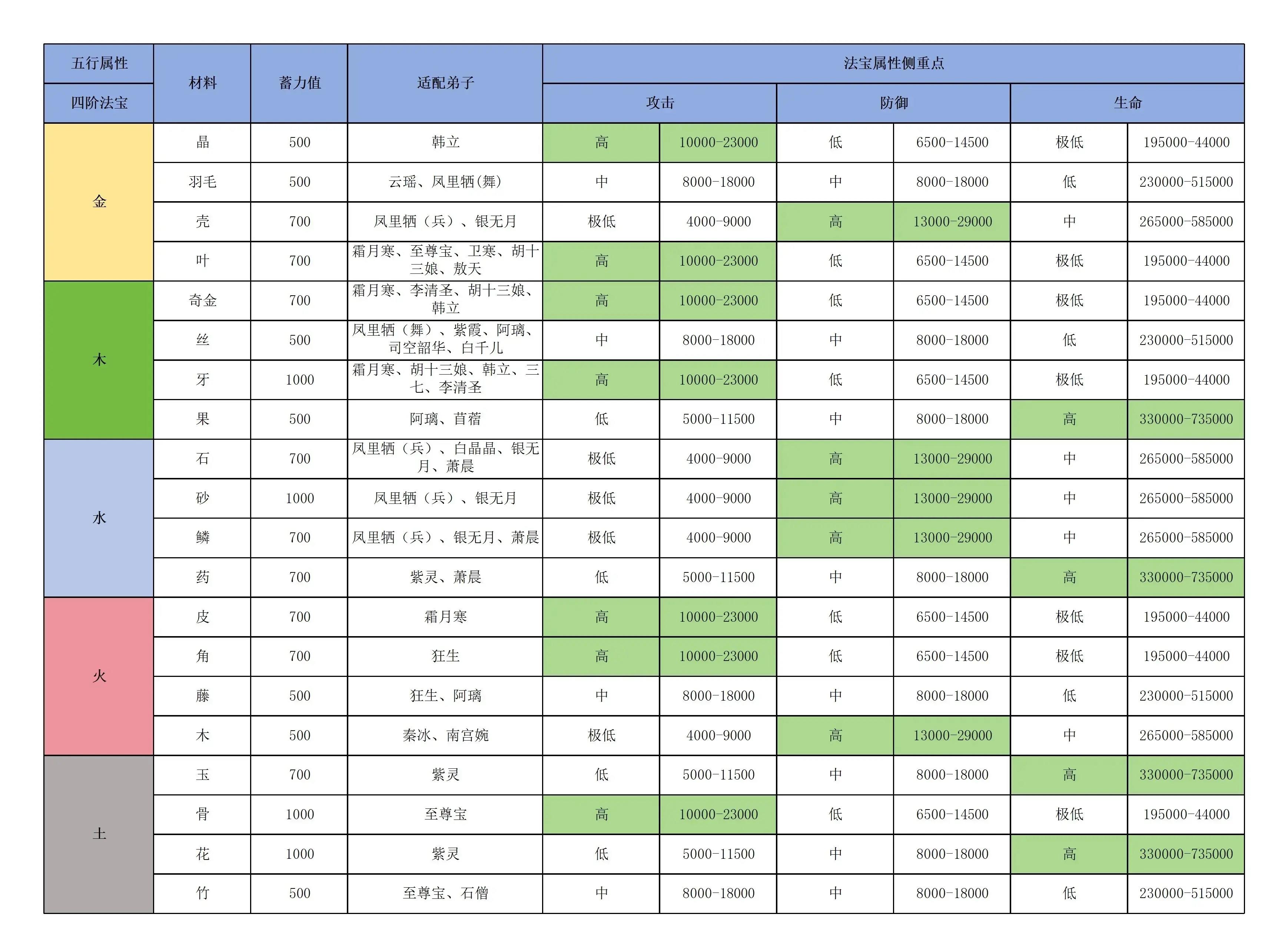 - 属性最大化:使用全部四阶材料可获得最高的基础属性和五行威力加成。