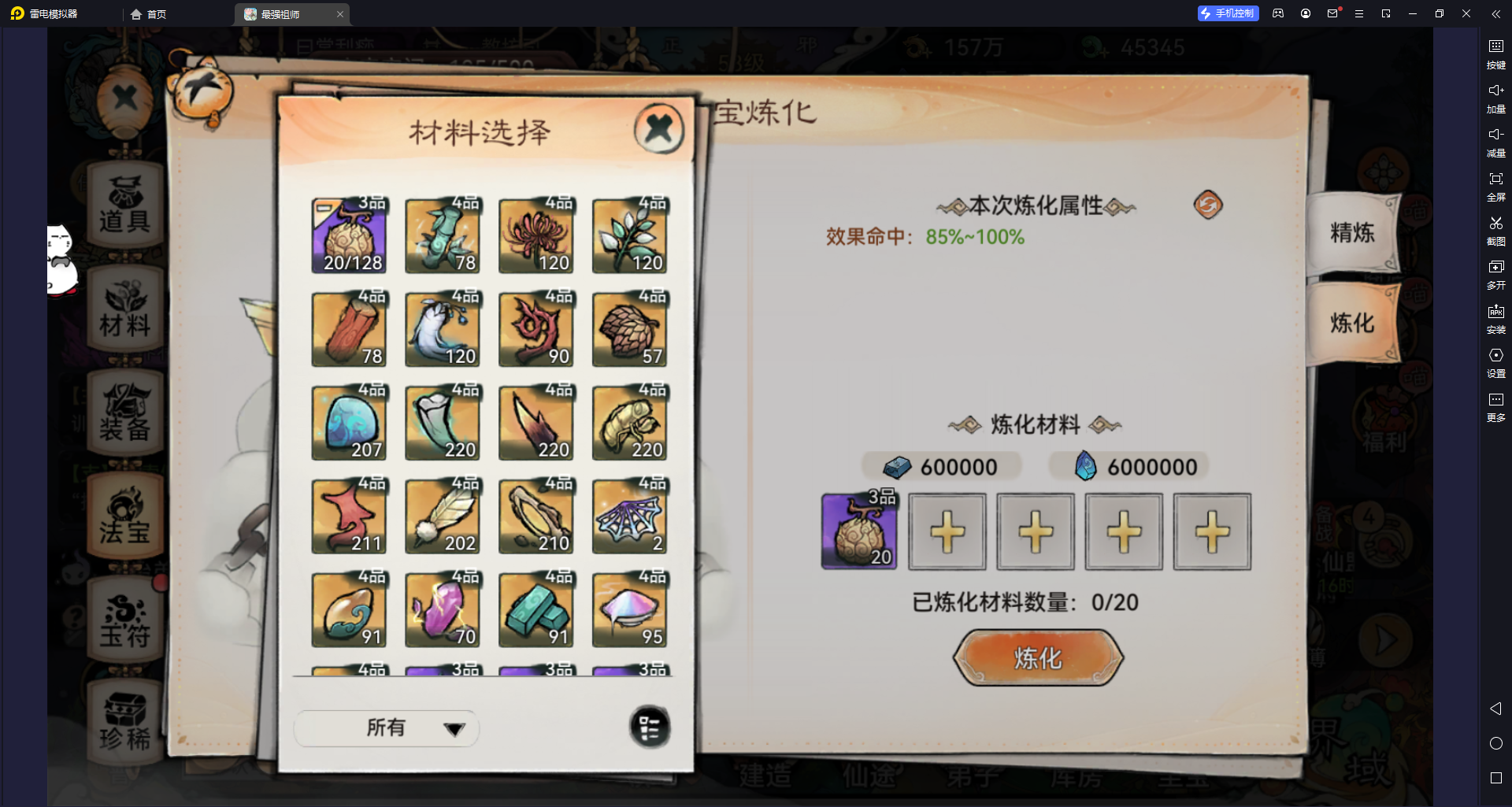 - 理由:现阶段四阶材料匮乏,推荐全部使用三阶材料进行炼化,后期四阶材料充裕再重新炼化。这样可以让核心角色尽快拥有四阶法宝,加快队伍成型。