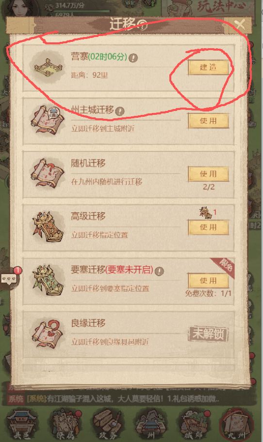 修建好营寨之后,点击自己的寨子,选择搬迁到此地,一次迁城就完成了。