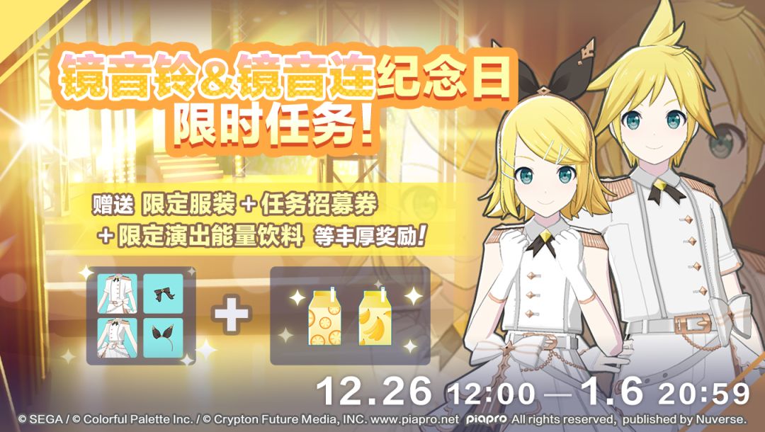 我们将于 12/26 12:00 起开放「镜音铃&镜音连纪念日限时任务」,