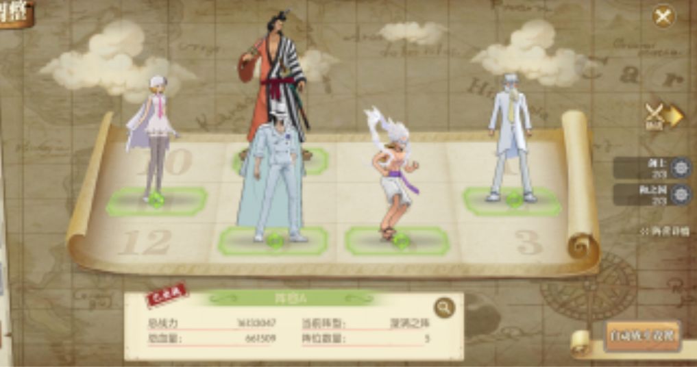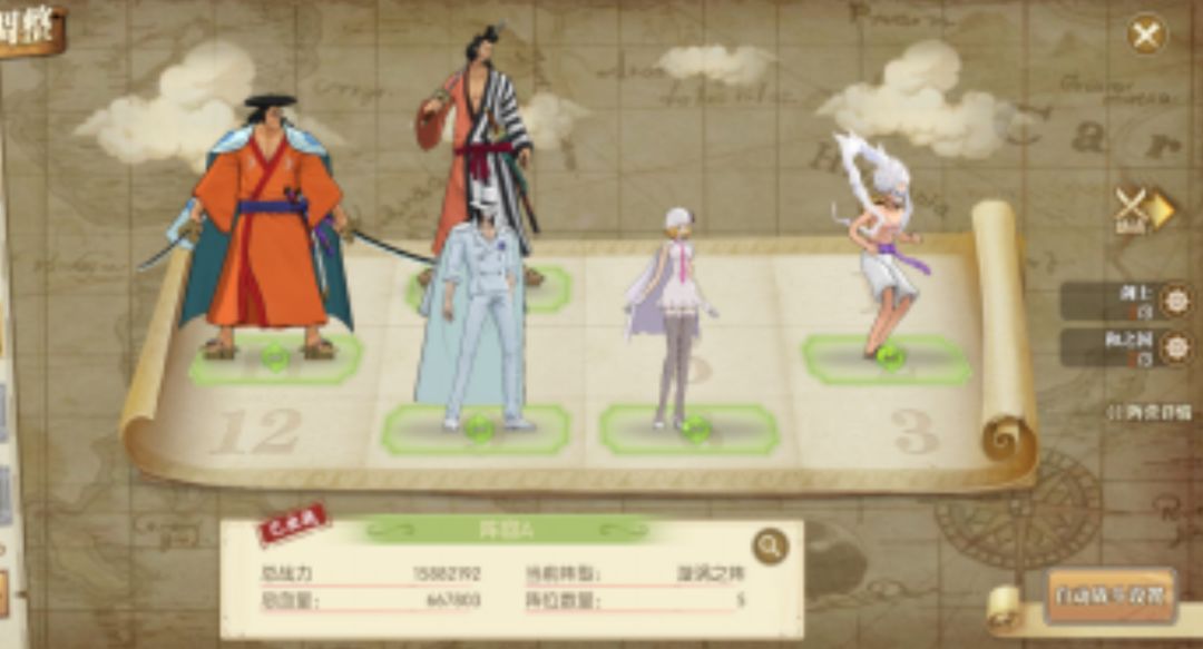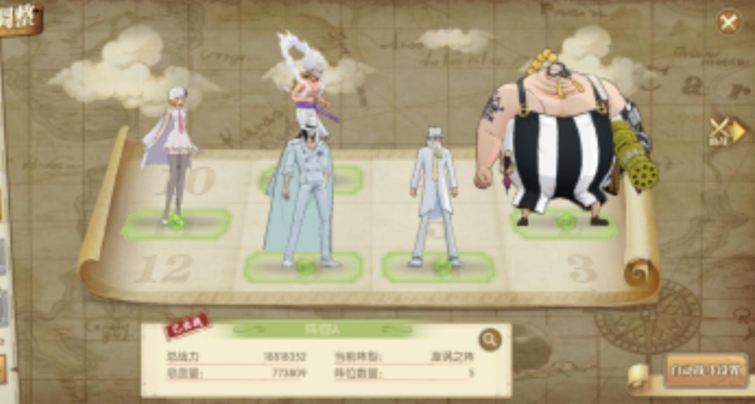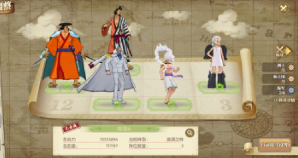 这套阵容和阵容二的只是御田和卡古的不同,但是玩法基本一样,御田的上场则是可以多一个同泽目标,同时提升锦卫门的坦度,玩法思路和阵容二相同,这里漩涡阵减速位可以选择五档路飞,也可以选择御田。