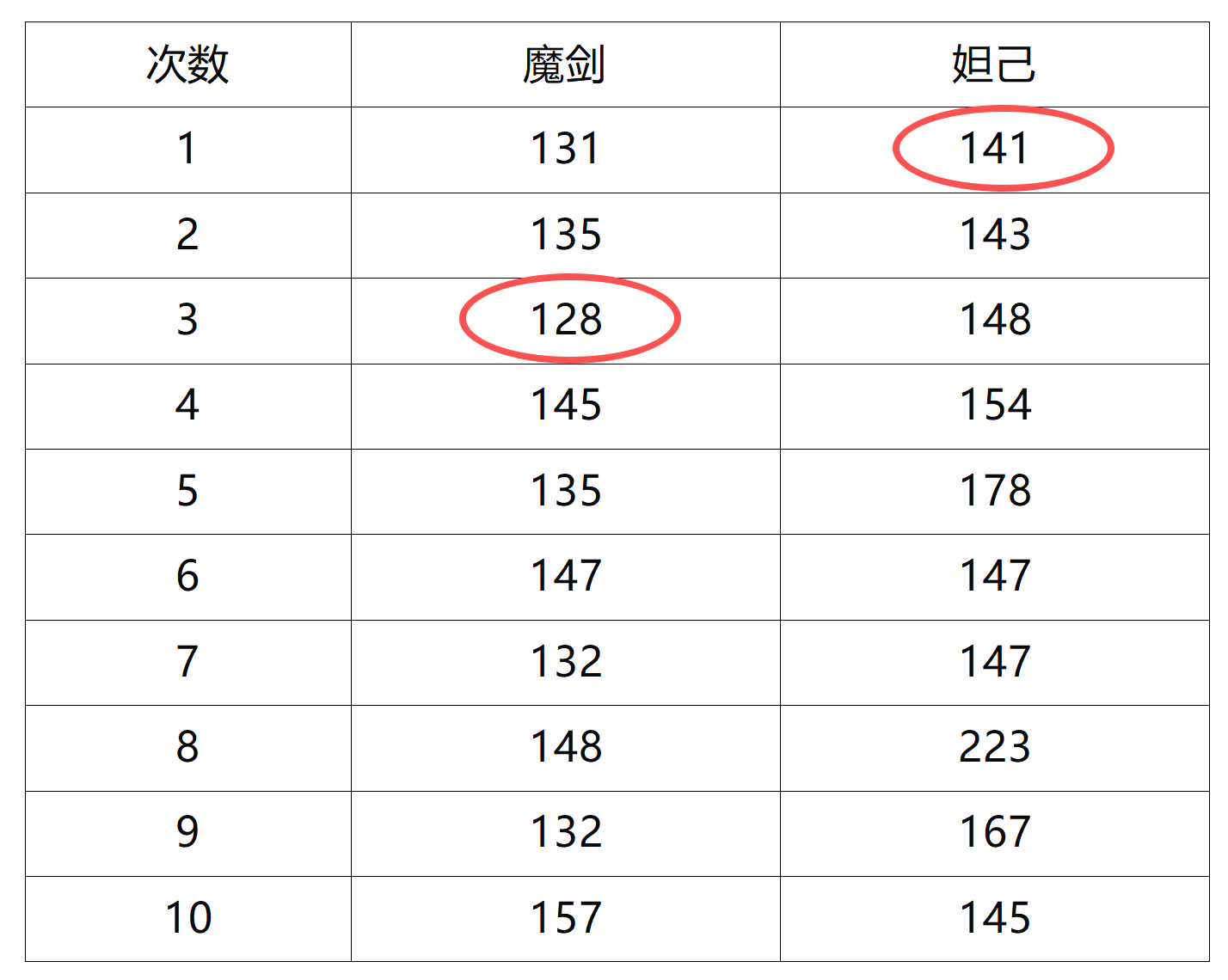 从测试结果来看,差不多面板的情况下,魔剑最低输出打了128M,妲己最低则高达141M。