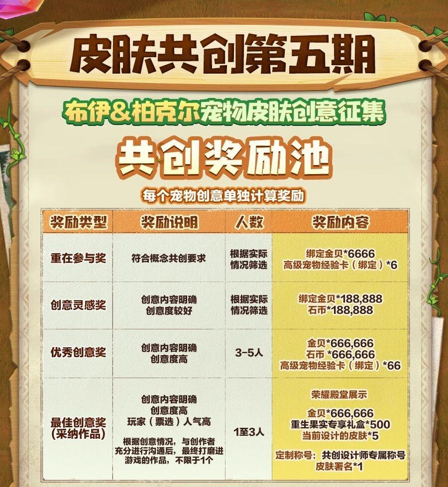 宠物皮肤共创活动,是基于宠物自身形态进行创意灵感设计,其核心在于“创意”表达,我们希望更多玩家参与到“创意”中,为宠物的外观提供更多灵感来源,因此对玩家投稿的图片完成形式和精细度不做要求。