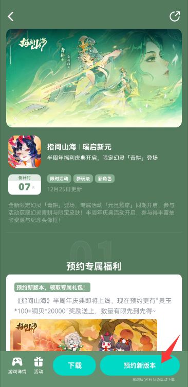 星主们也可以在个人界面中,点击“我的游戏”,找到《指间山海》游戏,点击新版本弹窗,即可进入“预约新版本”界面。