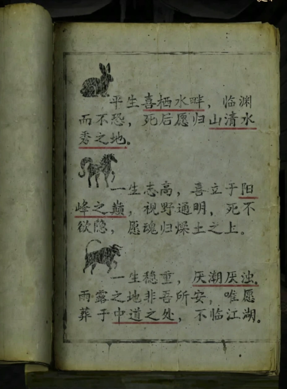 后退来到供桌场景,对供桌使用【供果】和【点燃的香】后查看旁边的笔记本,果然能翻开第二页了,让我们给他们归位,记一下各自喜欢的位置【兔水边山清水秀】【马高处】【牛干燥没水】【鸡没草沙场或者财宝旁边】【鼠密室】,看完之后退出来桌子上就能拿到5个牌子了,记得香炉中的【印】也拿走。