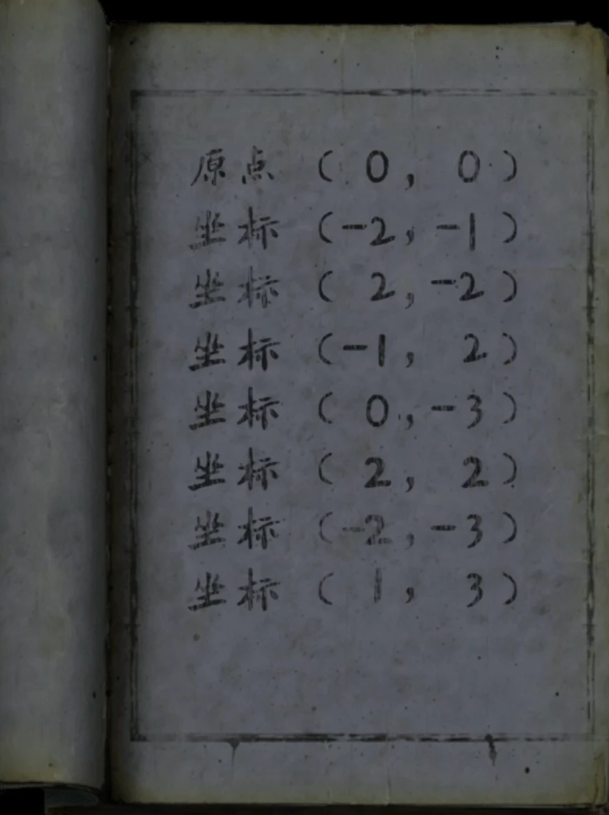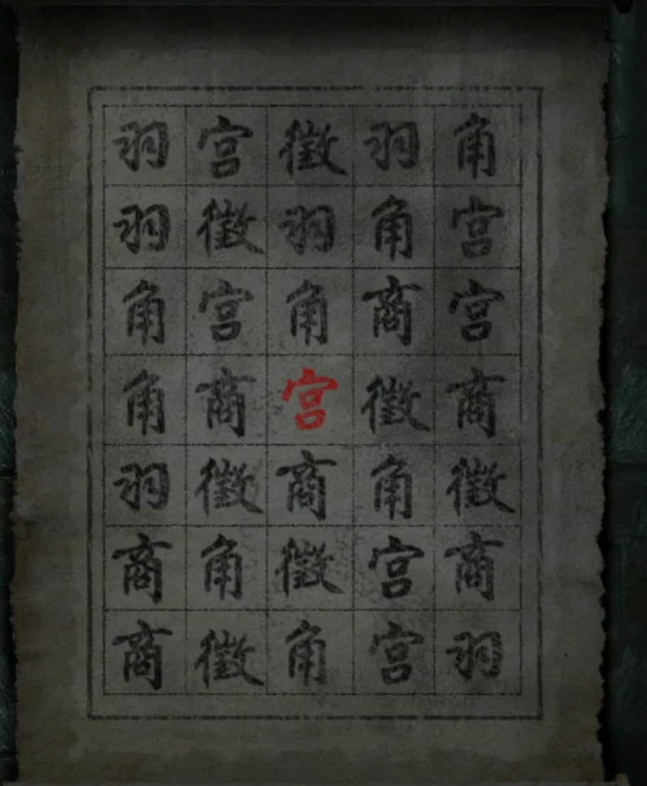 旁边的书看一眼,第二页有坐标就是对应宫字图了,第一个数字指的是左右,第二个数字指的是上下,因为上下才有3,按照这个线索结合上面宫字图推断一下我们可以获得一串音符【宫羽商徵角宫商羽】记下来,这个就是敲钟的线索了。