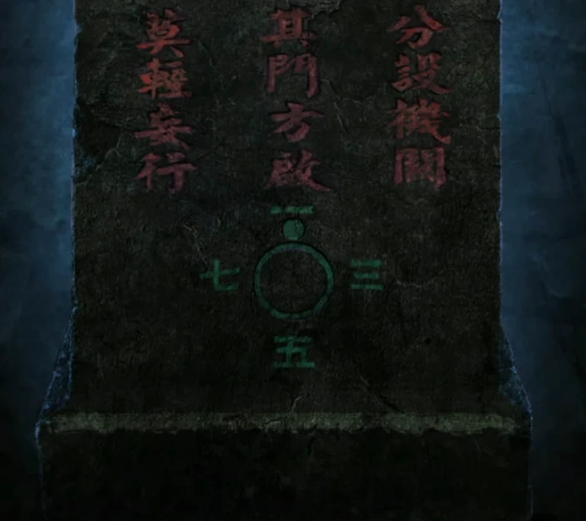 继续第三章攻略,剧情过后查看一下左右墙上的狮子,左边是面对面,右边是背对背,这就是前面的四个狮子状态,但是我们还少一只狮子先记下来,查看左侧石碑,注意下面的图案是圆形上面有一个圆点,从圆点开始顺时针1357,先记下来。
