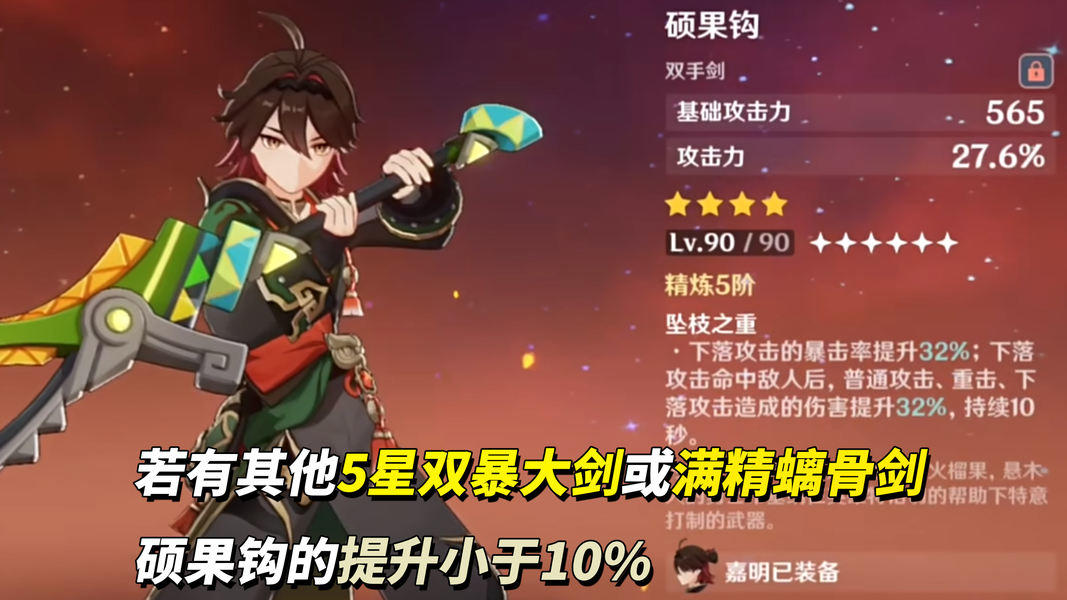 硕果钩嘉明可用,565攻击27.6%攻击加成,精1/精5数值如下,16/32%下落暴击,下落命中后提升普攻、重击、下落16/32%增伤10秒。
